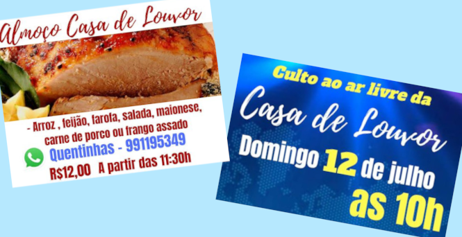 Neste domingo dia 12/07/2020 às 10h, teremos no Culto ao ar livre e logo após o culto teremos o almoço.