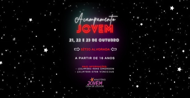 Nos dias 21, 22 e 23 de outubro de 2022, acontecerá nosso 1º Acampamento Jovem da Casa de Louvor. Serão 3 dias de um tempo de cura e renovo para nossos jovens.